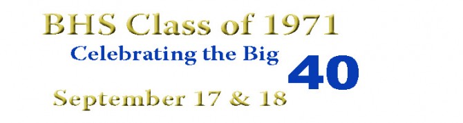 The Berthoud High School Graduating Class of 1971 would like to announce that we will be meeting at the Derby Grill at 5:00 p.m. Saturday September 17 for a dinner. This is for classmates, their spouses and guests only. Sunday, September 18, at noon there will be a picnic in Berthoud Park by the old swimming pool. Anyone who would like to stop in and visit is cordially invited to do so. If you wish to eat with the group, please bring a couple dishes and table service. Our thanks to Chris ( Dechant ) Eitzman for her efforts in the organization the reunion.
