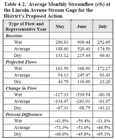 Save the Poudre points to an undisputed section of the Draft Environmental Impact Statement, page 292, Table 4-2 (below) that shows that in an average year NISP will remove between 46.5% – 71.3% of what water still remains in the Poudre River through Fort Collins and downstream: