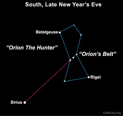 Sirius is highest in the sky at midnight every New Year’s. Astronomers call this a ‘midnight culmination’ of Sirius. Midnight culmination for Sirius comes tomorrow night, but tonight it is nearly the same. As the New Year rings in, Sirius is at its highest.